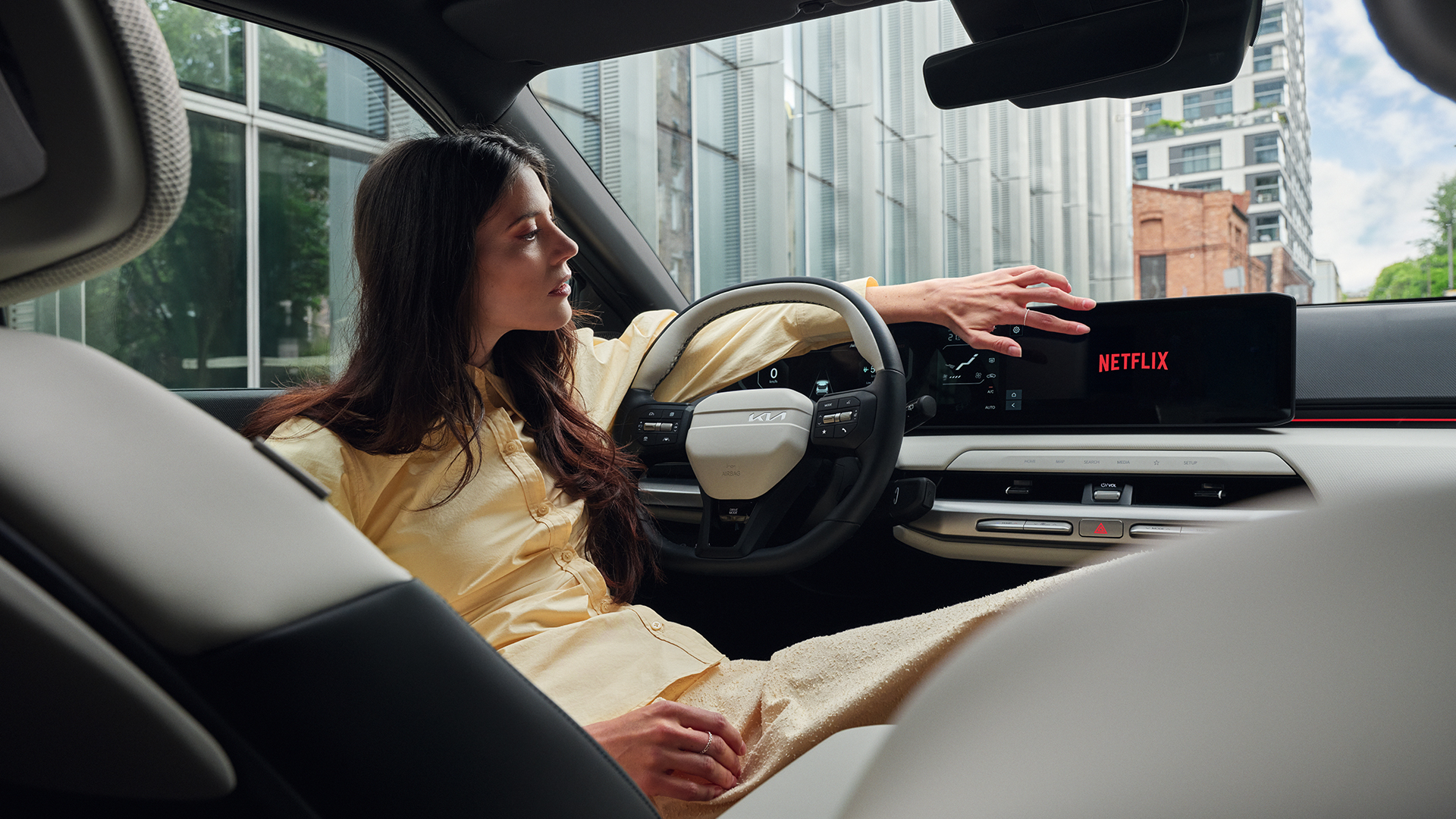 Der Kia EV4 bietet dir ein klares, hochwertiges Interieur mit durchdachten Details für maximalen Komfort – wie breite Panoramadisplays, Relaxation-Sitze und clevere Stauraumlösungen.